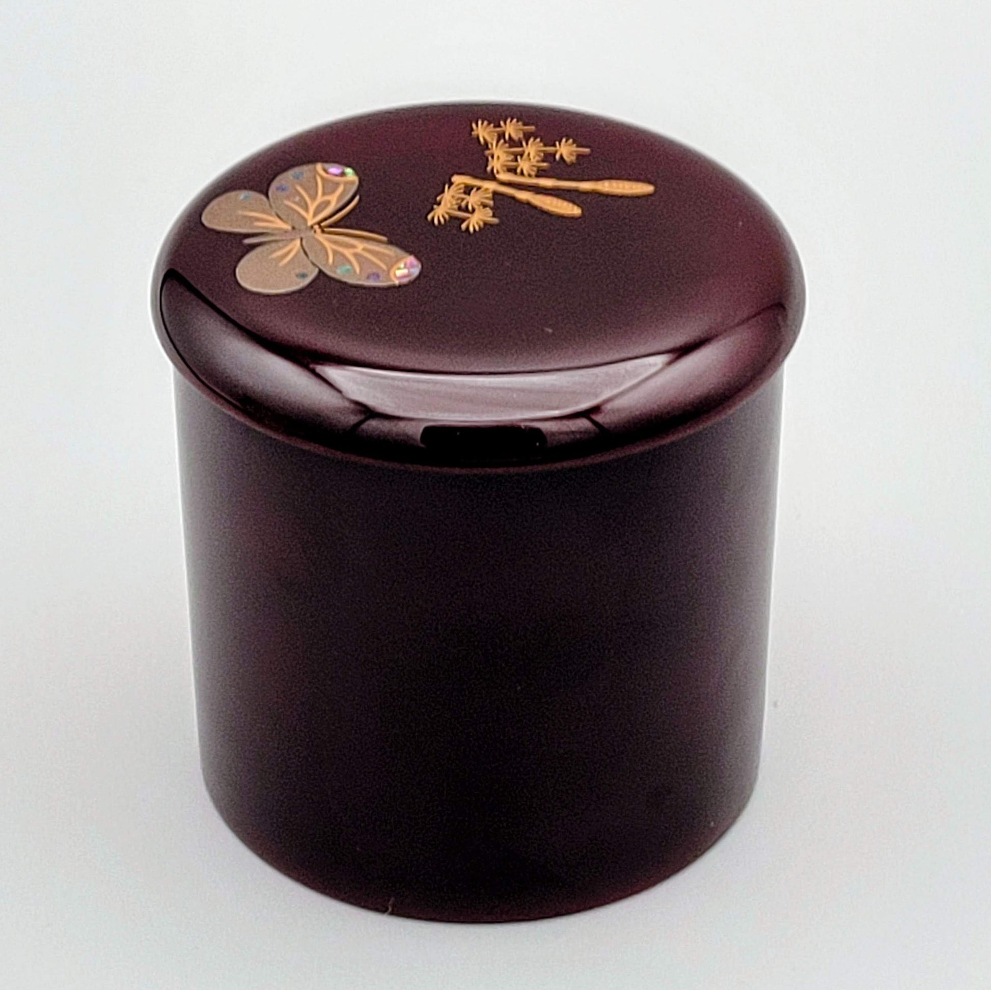 Het oppervlak is bedekt met meerdere lagen transparante roodbruine urushi-lak (透漆, suki-urushi), wat zorgt voor een warme, diepteglans die de onderlagen laat doorschemeren. Daarop zijn in goudpoeder (金粉) en zilverpoeder (makie) sierlijke motieven aangebracht van lenteplanten (haruno), waaronder bloeiende veldbloemen en varens. Op het deksel fladdert een vlinder met vleugels ingelegd in parelmoer (raden 螺鈿), een teken van gratie, lichtheid en wedergeboorte.