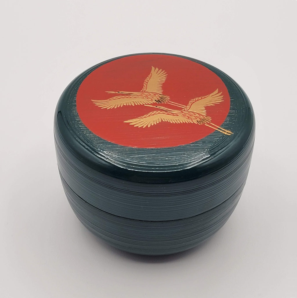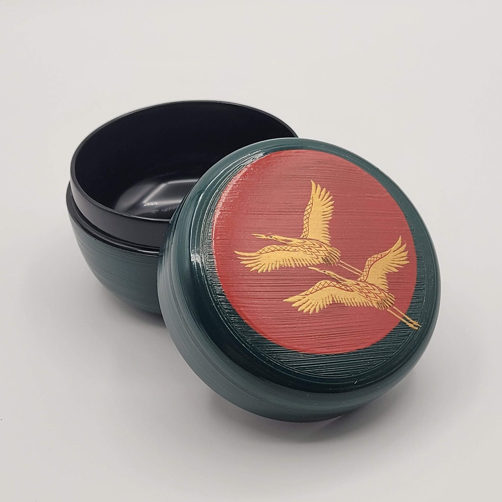 Deze grote natsume van Miyata Munekage 宮田宗景 is uitgevoerd in diep blauw-groen gelakt hout (ao-urushi) en subtiel versierd met een maki-e voorstelling van twee vliegende kraanvogels tegen een warme rood-oranje opkomende zon. De zichtbare penseellijnen in de lak zijn uitgevoerd in 刷毛目塗り (hakeme-nuri), een traditionele techniek waarbij de penseelstreken bewust zichtbaar blijven. Dit benadrukt het ambachtelijke karakter, geeft diepte en textuur, en laat het licht op een levendige, natuurlijke manier weerkaatsen.